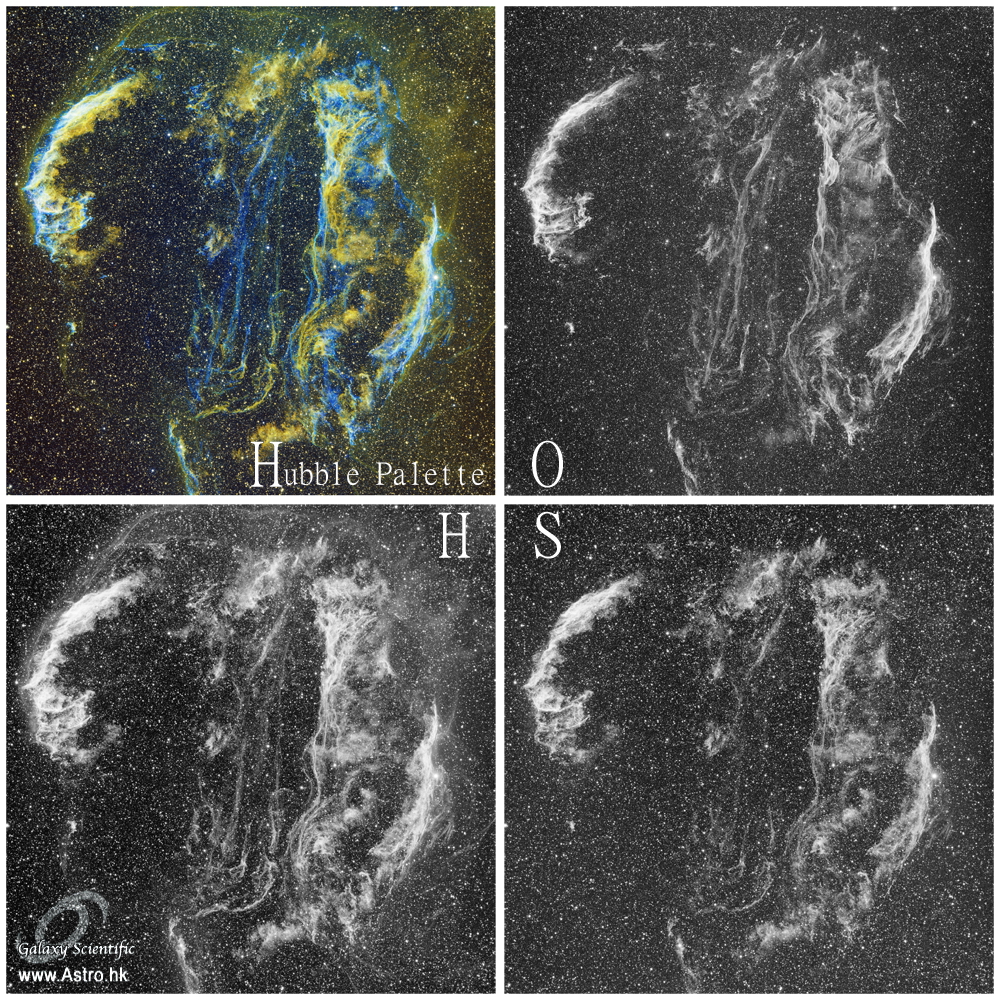 因為重新處理過照片,我想強調自己當時是看到OIII通道的東西(即下圖右上的O),星雲的形態跟Ha或SII通道(即下圖下的H及S)是有點分別的,後兩者的質感比較相近,但SII的訊號往往比Ha弱。